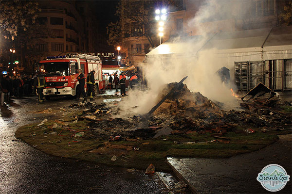 La Nit del Foc (Ateş Gecesi): Çoğu Avrupa kenti gibi Valencia da nehir kenarına kurulmuş bir şehir. Şehrin büyüyüp, yayılmasıyla günümüzde bu nehir, şehri ikiye ayırır duruma gelmiş. Çok geniş bir nehir yatağına sahip Turia Nehri'nin; 1957'de taşmasıyla Valencia tarihindeki en büyük felaketle karşı karşıya kalmış. Birçok kişinin hayatını kaybettiği bu sel o kadar büyükmüş ki; belli yerlerde apartmanların üçüncü katlarına kadar sular yükselmiş. Bu felaketin tekrarlanması ihtimaline karşı, radikal bir kararla nehir yatağı değiştirilmiş ve şehrin dışından dolandırılarak denize dökülmesi sağlanmış. Uzun süre atıl kalan nehir yatağı, bir süre sonra günümüzdeki kullanım şeklini almış; yürüyüş ve bisiklet yollarıyla, rekreasyon ve spor alanlarıyla şehrin ortasından geçen lineer bir kent parkı! İnsanlar tarafından çok kullanılan bu park hala eski ismiyle anılıyor; insanlar parka gidiyorum değil, nehire gidiyorum diyor:) Bu lineer park, Las Fallas zamanı her gece yapılan havai fişek gösterilerine ev sahipliği yapıyor. Her akşam bir öncekinden daha gösterişli olan bu gösteri 18 mart gecesi doruk noktasına ulaşıyor ve bu sebeple bu geceye ateş gecesi (the night of fire/la nite del foc) deniyor.